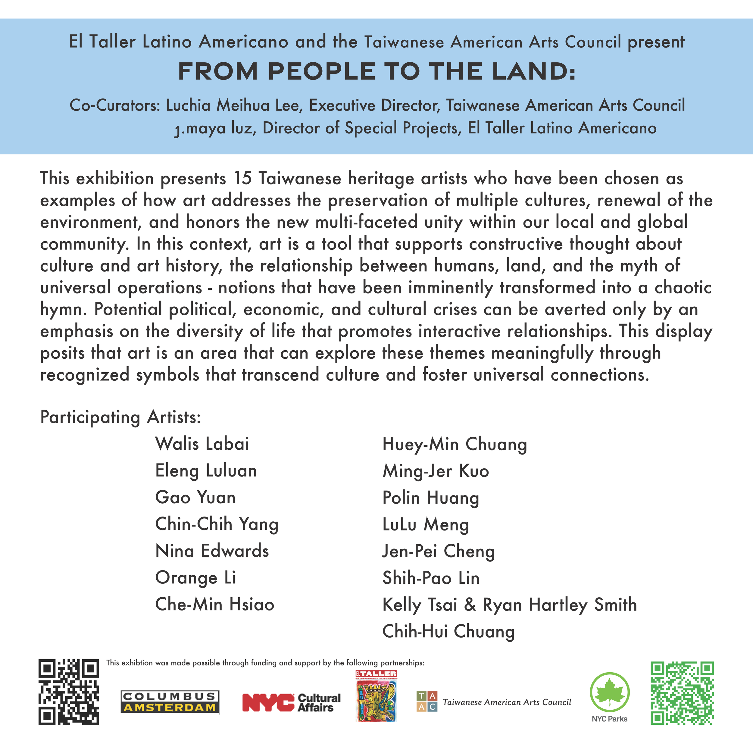 Participating 20 Artists: Taiwan: Chen Ching-Lin 陳景林, Chuang Hui-Lin 莊惠琳, Eleng Luluan 安聖惠(峨冷), Teresa Huang 黃麗絹, Huang Wen-Ying 黃文英, Huang Yen-Chao 黃彥超, Huang Yu-Chih 黃裕智, Wu Wen-Chi 吳汶錡, Yang Wei-Lin 楊偉林,Wen-Fu Yu 游文富。.NY; Steven Balogh, Hiroshi Jashiki (謝敷 宏), Ming Jer Kuo (郭明哲), Catherine Lan (藍巧茹), Lulu Meng (孟祥璐), John Ensor Parker, Sarah Walko , Poyen Wang (王博彥), Chin Chih YANG (楊金池)